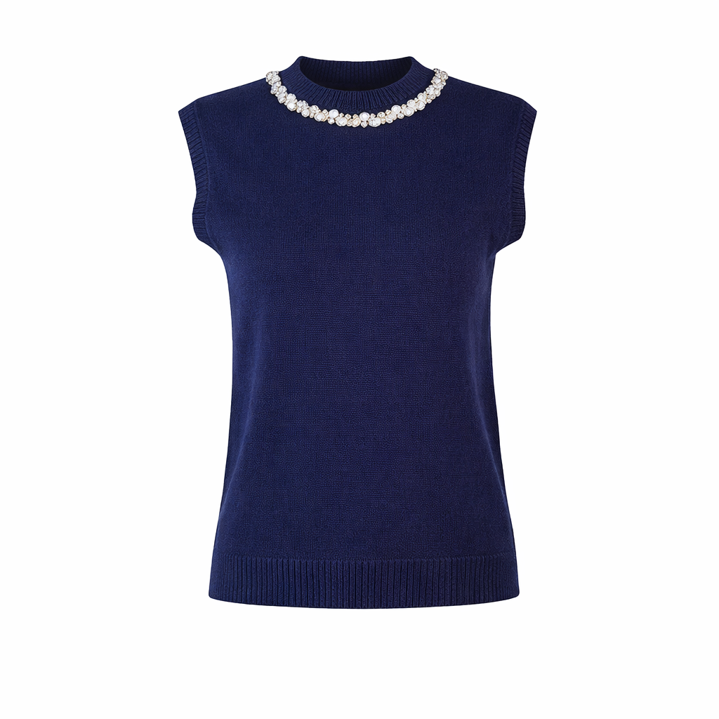 Elevate your wardrobe with this stunning sleeveless knit featuring an embellished rhinestone collar in a beautiful blue tone. The eye-catching rhinestone detailing at the neckline adds instant glamour and sophistication, transforming this piece into a true statement maker. The sleeveless design offers perfect versatility for layering during cooler months or wearing solo when temperatures allow, making it an adaptable addition to your closet. The rich blue hue provides a flattering backdrop for the sparkling rhinestones, creating a harmonious balance between elegance and visual interest. Whether you're dressing for a special occasion, evening event, or simply want to add polish to your everyday look, this knit delivers confidence and refined style. Layer it effortlessly under jackets, blazers, or cardigans for added dimension, or pair it with tailored bottoms for a complete, polished ensemble. The quality construction ensures the rhinestones remain brilliantly secure, maintaining their sparkle through countless wears. Perfect for anyone seeking to express their individual style with understated luxury and timeless appeal.
