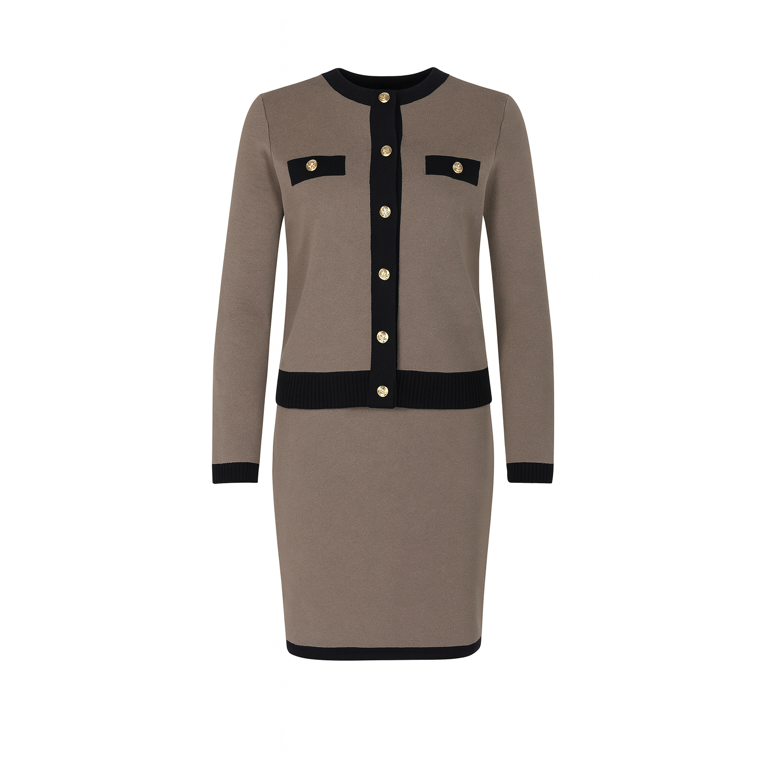- The short knit skirt offers a flattering fit that complements the cardigan, creating a balanced and stylish look.